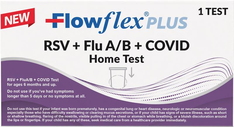 The Flowflex Plus RSV + Flu A/B + COVID Home Test is a lateral flow immunoassay intended for the rapid, simultaneous qualitative detection and differentiation of respiratory syncytial virus (RSV), influenza A, influenza B (Flu A/B), and SARS-CoV-2 (COVID) protein antigens. This test is authorized for non-prescription home use with self-collected anterior nares nasal swab specimens. This is not only the first device of its kind with four analytes in one test (4-in-1), and the first RSV home test, but it is also the first respiratory home test to earn FDA clearance for children aged 6-23 months when administered by an adult using ACON’s proprietary nasal swab guard.